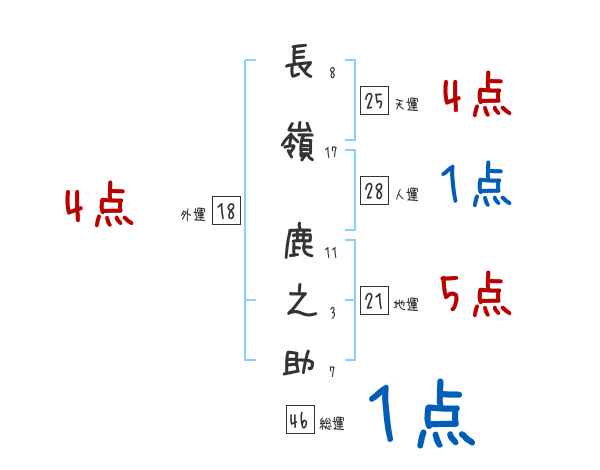 天運![]() | 長嶺鹿之助さんの天運は25画の4つ星!個性があり才能があふれる。強運の持ち主で発展する。 家系が持つ宿命的な運勢を表します。祖先から受け継いだ苗字ですので自分の力が及びません。家柄を象徴します。 |