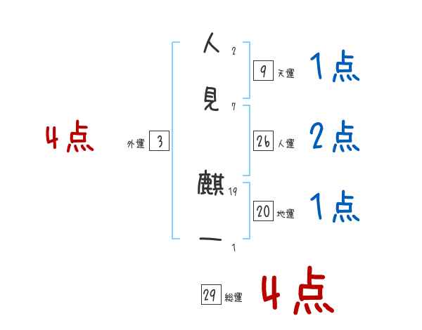 総運![]() | 人見麒一さんの総運は29画の4つ星!完全主義で才能がある。厳格な心の持ち主。 あなたの人生を表す1番重要な運勢です。生涯を通じて影響する総合運となり、主に50歳以降の晩年期に影響を及ぼします。 |