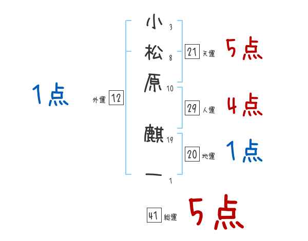 天運![]() | 小松原麒一さんの天運は21画の5つ星!統率力がある。独立し成功する。名誉を手に入れる。 家系が持つ宿命的な運勢を表します。祖先から受け継いだ苗字ですので自分の力が及びません。家柄を象徴します。 |