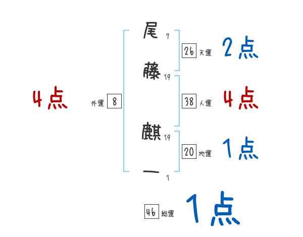 人運![]() | 尾藤麒一さんの人運は38画の4つ星!温厚な性格で技術的な才能を発揮する。職人的な仕事に向いている。 性格や才能などを表す2番目に重要な運勢です。人間関係や協調性、社会的な成功に影響します。主に20歳から50歳ぐらいまでの中年期の運勢を表します。 |