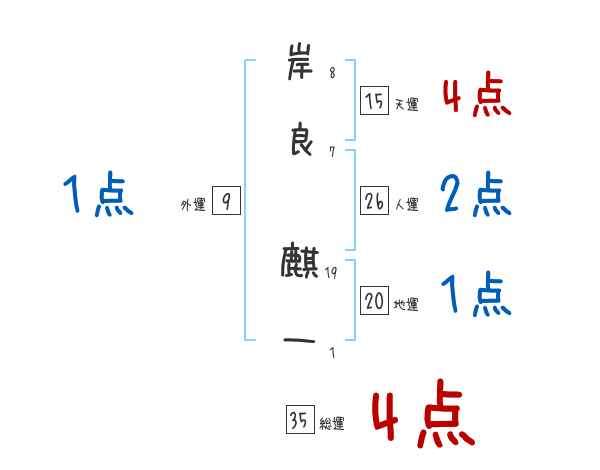 総運![]() | 岸良麒一さんの総運は35画の4つ星!温厚な性格で感受性が高い。穏和な性格で人望が厚い。 あなたの人生を表す1番重要な運勢です。生涯を通じて影響する総合運となり、主に50歳以降の晩年期に影響を及ぼします。 |