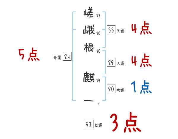 外運![]() | 嵯峨根麒一さんの外運は24画の5つ星!家庭運が良く順調な人生。金運にも恵まれる。 生活面を象徴する運勢です。外部から受ける影響力を表し、結婚運、家庭運や職場、環境への順応性を表します。 |