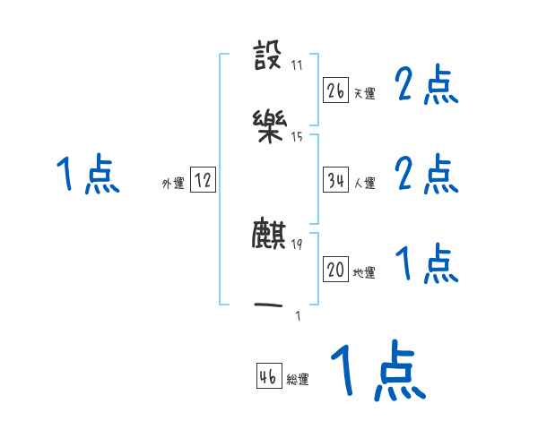総運![]() | 設樂麒一さんの総運は46画の1つ星!迷走することが多く苦労するかも。目先のことにとらわれないように。 あなたの人生を表す1番重要な運勢です。生涯を通じて影響する総合運となり、主に50歳以降の晩年期に影響を及ぼします。 |