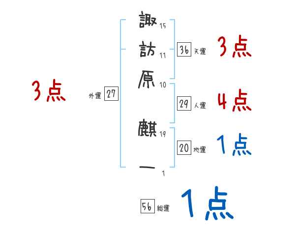 天運![]() | 諏訪原麒一さんの天運は36画の3つ星!先見性が豊かです。多少神経質で苦労することも。 家系が持つ宿命的な運勢を表します。祖先から受け継いだ苗字ですので自分の力が及びません。家柄を象徴します。 |