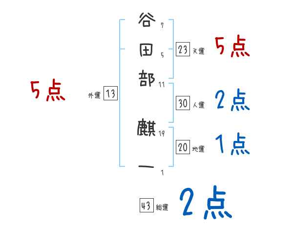 天運![]() | 谷田部麒一さんの天運は23画の5つ星!想像力に優れ活力がある。一代で成功し名誉を手に入れる。 家系が持つ宿命的な運勢を表します。祖先から受け継いだ苗字ですので自分の力が及びません。家柄を象徴します。 |