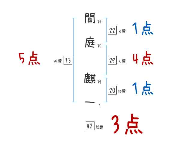 天運![]() | 間庭麒一さんの天運は22画の1つ星!努力することが苦手ないっぽう手先が器用。芸術性にも優れる。 家系が持つ宿命的な運勢を表します。祖先から受け継いだ苗字ですので自分の力が及びません。家柄を象徴します。 |