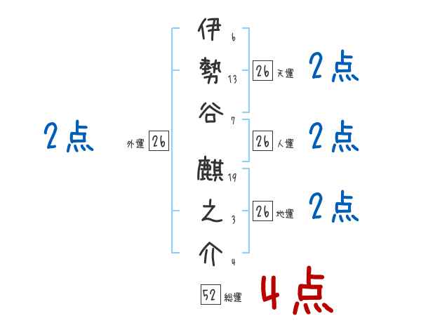 総運![]() | 伊勢谷麒之介さんの総運は52画の4つ星!先見性と独創性に優れ考える力がある。強運の持ち主。 あなたの人生を表す1番重要な運勢です。生涯を通じて影響する総合運となり、主に50歳以降の晩年期に影響を及ぼします。 |