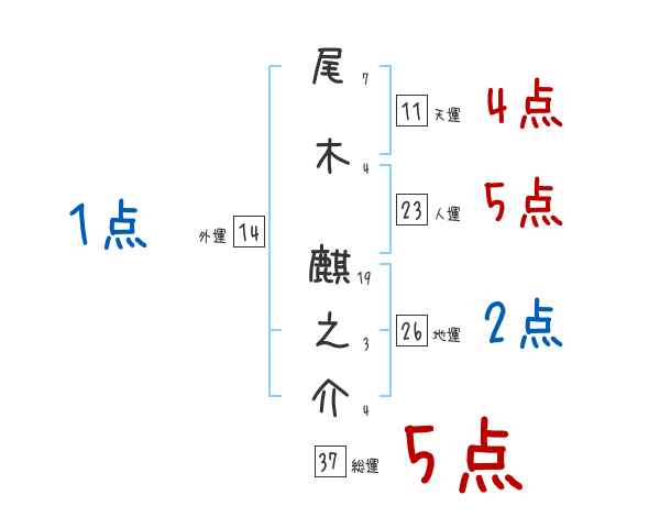 人運![]() | 尾木麒之介さんの人運は23画の5つ星!想像力に優れ活力がある。一代で成功し名誉を手に入れる。 性格や才能などを表す2番目に重要な運勢です。人間関係や協調性、社会的な成功に影響します。主に20歳から50歳ぐらいまでの中年期の運勢を表します。 |