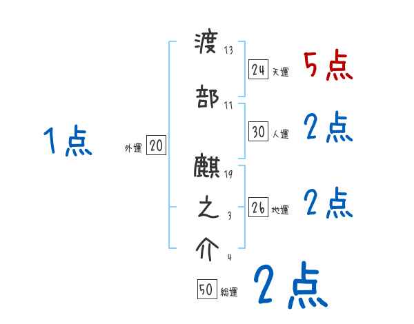 天運![]() | 渡部麒之介さんの天運は24画の5つ星!家庭運が良く順調な人生。金運にも恵まれる。 家系が持つ宿命的な運勢を表します。祖先から受け継いだ苗字ですので自分の力が及びません。家柄を象徴します。 |