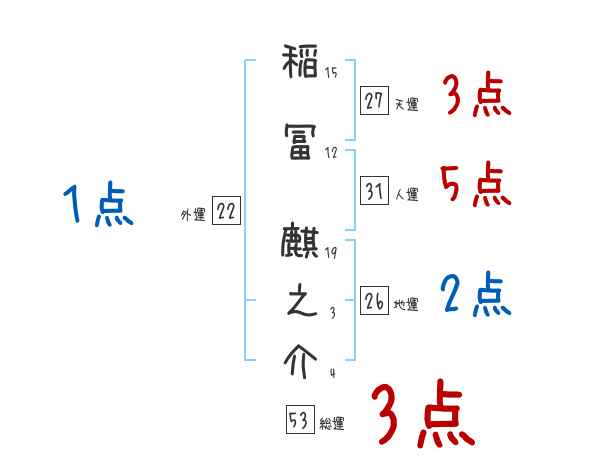 総運![]() | 稲冨麒之介さんの総運は53画の3つ星!やや見栄っ張りで虚栄心がある。散財に注意。 あなたの人生を表す1番重要な運勢です。生涯を通じて影響する総合運となり、主に50歳以降の晩年期に影響を及ぼします。 |