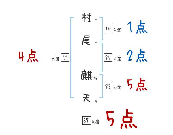 総運![]() | 村尾麒天さんの総運は37画の5つ星!努力家で順応性に優れる。現実的な考え方ができ忠実に物事をこなす。 あなたの人生を表す1番重要な運勢です。生涯を通じて影響する総合運となり、主に50歳以降の晩年期に影響を及ぼします。 |