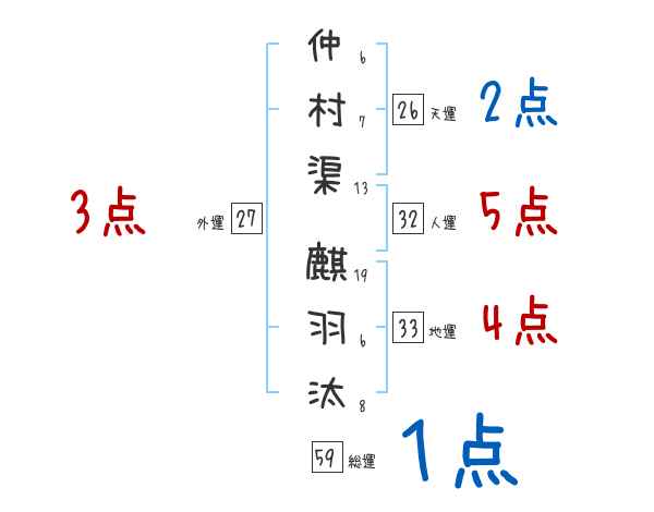 仲村渠麒羽汰さんの画数の鑑定結果