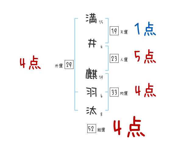 外運![]() | 満井麒羽汰さんの外運は29画の4つ星!完全主義で才能がある。厳格な心の持ち主。 生活面を象徴する運勢です。外部から受ける影響力を表し、結婚運、家庭運や職場、環境への順応性を表します。 |