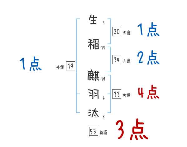 総運![]() | 生稲麒羽汰さんの総運は53画の3つ星!やや見栄っ張りで虚栄心がある。散財に注意。 あなたの人生を表す1番重要な運勢です。生涯を通じて影響する総合運となり、主に50歳以降の晩年期に影響を及ぼします。 |