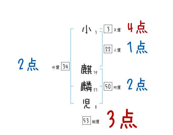 総運![]() | 小麒麟児さんの総運は53画の3つ星!やや見栄っ張りで虚栄心がある。散財に注意。 あなたの人生を表す1番重要な運勢です。生涯を通じて影響する総合運となり、主に50歳以降の晩年期に影響を及ぼします。 |