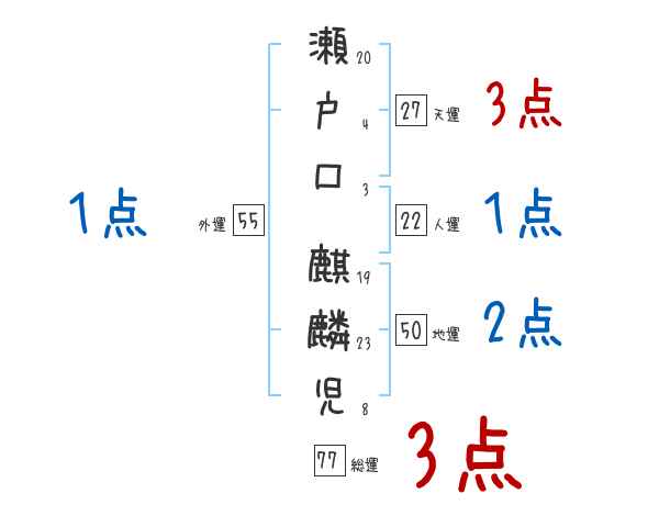 総運![]() | 瀬戸口麒麟児さんの総運は77画の3つ星!多少不安定であるが晩年は吉。不屈の精神。 あなたの人生を表す1番重要な運勢です。生涯を通じて影響する総合運となり、主に50歳以降の晩年期に影響を及ぼします。 |