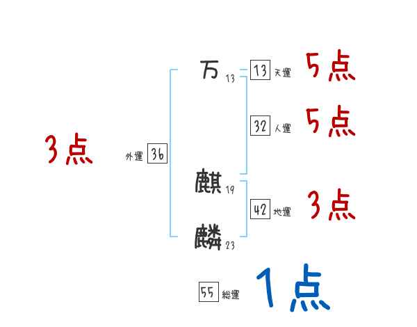 天運![]() | 万麒麟さんの天運は13画の5つ星!才能に恵まれ人気がある。名声を手に入れる。円満な人生。 家系が持つ宿命的な運勢を表します。祖先から受け継いだ苗字ですので自分の力が及びません。家柄を象徴します。 |