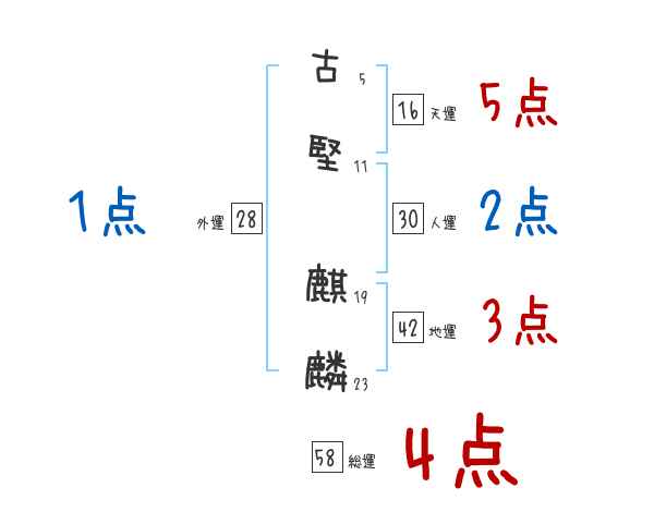 天運![]() | 古堅麒麟さんの天運は16画の5つ星!人望が厚く大きく発展する。逆転成功が見える。 家系が持つ宿命的な運勢を表します。祖先から受け継いだ苗字ですので自分の力が及びません。家柄を象徴します。 |