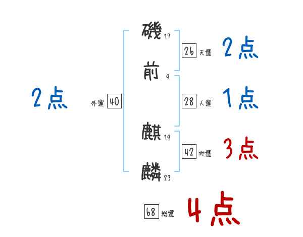 天運![]() | 磯前麒麟さんの天運は26画の2つ星!波瀾万丈かも。信頼できる人を大事にしましょう。 家系が持つ宿命的な運勢を表します。祖先から受け継いだ苗字ですので自分の力が及びません。家柄を象徴します。 |