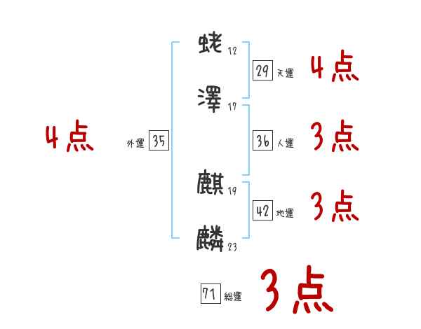 外運![]() | 蛯澤麒麟さんの外運は35画の4つ星!温厚な性格で感受性が高い。穏和な性格で人望が厚い。 生活面を象徴する運勢です。外部から受ける影響力を表し、結婚運、家庭運や職場、環境への順応性を表します。 |