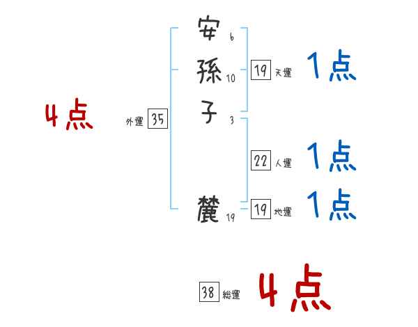外運![]() | 安孫子麓さんの外運は35画の4つ星!温厚な性格で感受性が高い。穏和な性格で人望が厚い。 生活面を象徴する運勢です。外部から受ける影響力を表し、結婚運、家庭運や職場、環境への順応性を表します。 |