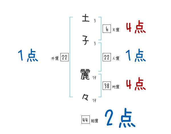 総運![]() | 土子麗々さんの総運は44画の2つ星!誠実で慎重な性格。物事を考えすぎないように注意しましょう。 あなたの人生を表す1番重要な運勢です。生涯を通じて影響する総合運となり、主に50歳以降の晩年期に影響を及ぼします。 |