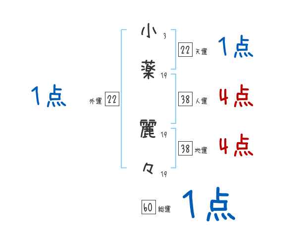 天運![]() | 小薬麗々さんの天運は22画の1つ星!努力することが苦手ないっぽう手先が器用。芸術性にも優れる。 家系が持つ宿命的な運勢を表します。祖先から受け継いだ苗字ですので自分の力が及びません。家柄を象徴します。 |