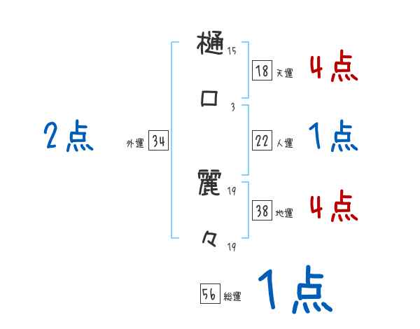天運![]() | 樋口麗々さんの天運は18画の4つ星!情熱的で剛気。忍耐力があり信頼される。 家系が持つ宿命的な運勢を表します。祖先から受け継いだ苗字ですので自分の力が及びません。家柄を象徴します。 |