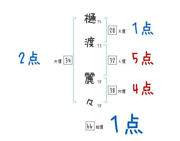 人運![]() | 樋渡麗々さんの人運は32画の5つ星!柔軟性があり成功する。チャンスが多く金運が良い。 性格や才能などを表す2番目に重要な運勢です。人間関係や協調性、社会的な成功に影響します。主に20歳から50歳ぐらいまでの中年期の運勢を表します。 |