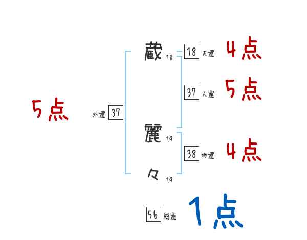 外運![]() | 蔵麗々さんの外運は37画の5つ星!努力家で順応性に優れる。現実的な考え方ができ忠実に物事をこなす。 生活面を象徴する運勢です。外部から受ける影響力を表し、結婚運、家庭運や職場、環境への順応性を表します。 |