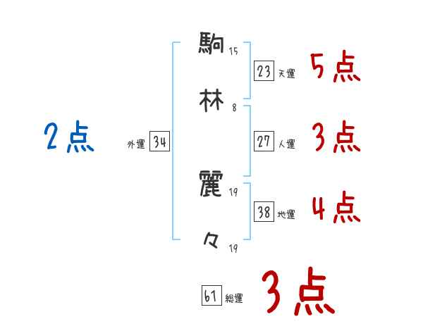 外運![]() | 駒林麗々さんの外運は34画の2つ星!独創性に優れるが、自尊心が強く災難に注意しましょう。 生活面を象徴する運勢です。外部から受ける影響力を表し、結婚運、家庭運や職場、環境への順応性を表します。 |