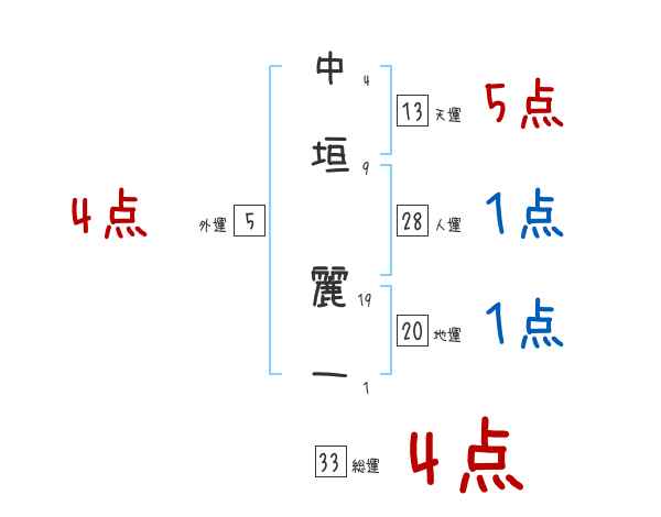天運![]() | 中垣麗一さんの天運は13画の5つ星!才能に恵まれ人気がある。名声を手に入れる。円満な人生。 家系が持つ宿命的な運勢を表します。祖先から受け継いだ苗字ですので自分の力が及びません。家柄を象徴します。 |