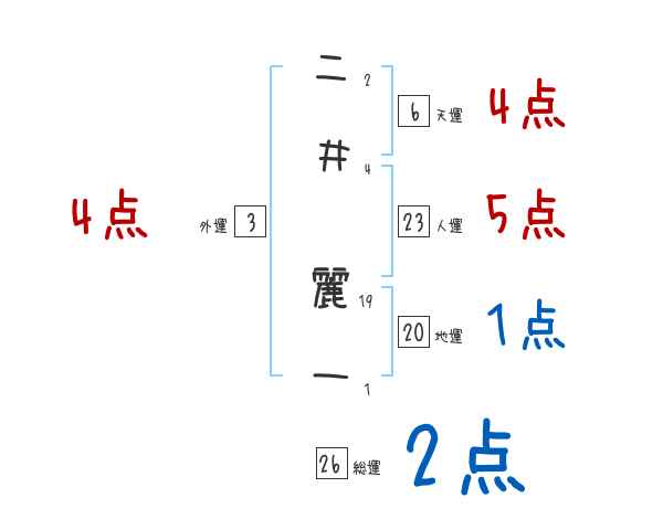 天運![]() | 二井麗一さんの天運は6画の4つ星!慎重な努力家で信頼を得る。誠実な精神で向上心に優れる。 家系が持つ宿命的な運勢を表します。祖先から受け継いだ苗字ですので自分の力が及びません。家柄を象徴します。 |