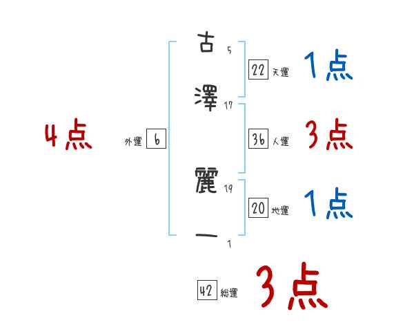 外運![]() | 古澤麗一さんの外運は6画の4つ星!慎重な努力家で信頼を得る。誠実な精神で向上心に優れる。 生活面を象徴する運勢です。外部から受ける影響力を表し、結婚運、家庭運や職場、環境への順応性を表します。 |