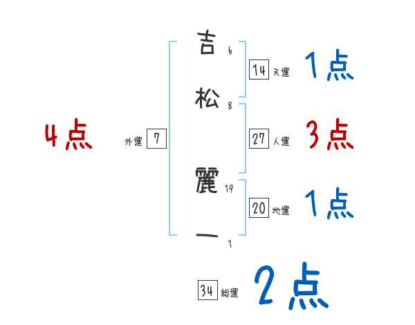 総運![]() | 吉松麗一さんの総運は34画の2つ星!独創性に優れるが、自尊心が強く災難に注意しましょう。 あなたの人生を表す1番重要な運勢です。生涯を通じて影響する総合運となり、主に50歳以降の晩年期に影響を及ぼします。 |
