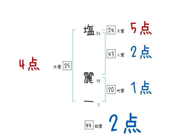 総運![]() | 塩麗一さんの総運は44画の2つ星!誠実で慎重な性格。物事を考えすぎないように注意しましょう。 あなたの人生を表す1番重要な運勢です。生涯を通じて影響する総合運となり、主に50歳以降の晩年期に影響を及ぼします。 |