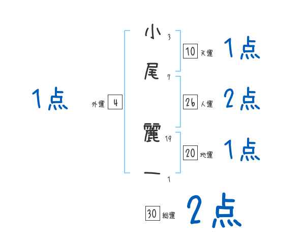 総運![]() | 小尾麗一さんの総運は30画の2つ星!浮き沈みの激しさに注意しましょう。 あなたの人生を表す1番重要な運勢です。生涯を通じて影響する総合運となり、主に50歳以降の晩年期に影響を及ぼします。 |
