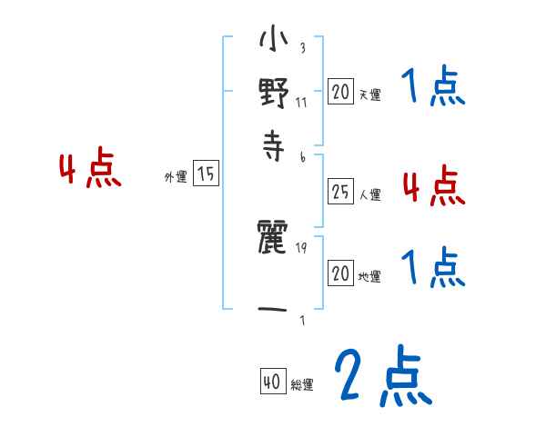 総運![]() | 小野寺麗一さんの総運は40画の2つ星!自信過剰で物事に固執するためトラブルに注意。 あなたの人生を表す1番重要な運勢です。生涯を通じて影響する総合運となり、主に50歳以降の晩年期に影響を及ぼします。 |