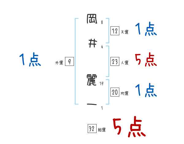 総運![]() | 岡井麗一さんの総運は32画の5つ星!柔軟性があり成功する。チャンスが多く金運が良い。 あなたの人生を表す1番重要な運勢です。生涯を通じて影響する総合運となり、主に50歳以降の晩年期に影響を及ぼします。 |
