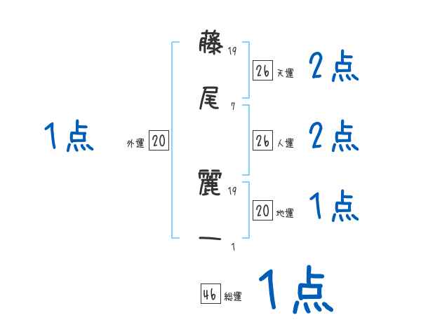 天運![]() | 藤尾麗一さんの天運は26画の2つ星!波瀾万丈かも。信頼できる人を大事にしましょう。 家系が持つ宿命的な運勢を表します。祖先から受け継いだ苗字ですので自分の力が及びません。家柄を象徴します。 |