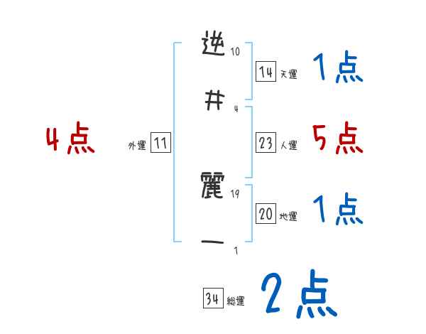 天運![]() | 逆井麗一さんの天運は14画の1つ星!人に対して優しいがストレスを溜め込みがち。人間関係のトラブルを避けるよう気をつけましょう。 家系が持つ宿命的な運勢を表します。祖先から受け継いだ苗字ですので自分の力が及びません。家柄を象徴します。 |