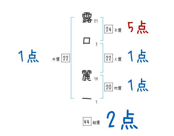 天運![]() | 露口麗一さんの天運は24画の5つ星!家庭運が良く順調な人生。金運にも恵まれる。 家系が持つ宿命的な運勢を表します。祖先から受け継いだ苗字ですので自分の力が及びません。家柄を象徴します。 |