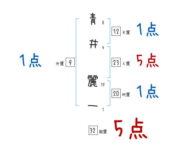 総運![]() | 青井麗一さんの総運は32画の5つ星!柔軟性があり成功する。チャンスが多く金運が良い。 あなたの人生を表す1番重要な運勢です。生涯を通じて影響する総合運となり、主に50歳以降の晩年期に影響を及ぼします。 |