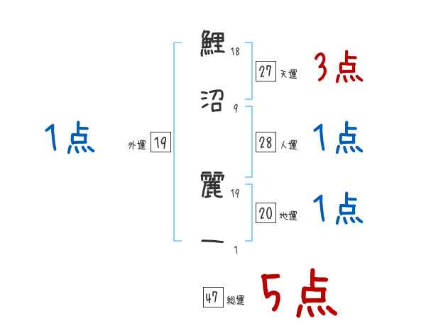 総運![]() | 鯉沼麗一さんの総運は47画の5つ星!実力が開花し発展する円満な人生。財に恵まれる。 あなたの人生を表す1番重要な運勢です。生涯を通じて影響する総合運となり、主に50歳以降の晩年期に影響を及ぼします。 |
