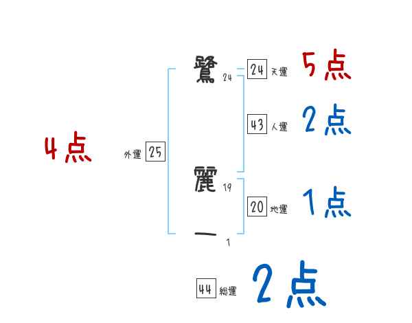 天運![]() | 鷺麗一さんの天運は24画の5つ星!家庭運が良く順調な人生。金運にも恵まれる。 家系が持つ宿命的な運勢を表します。祖先から受け継いだ苗字ですので自分の力が及びません。家柄を象徴します。 |