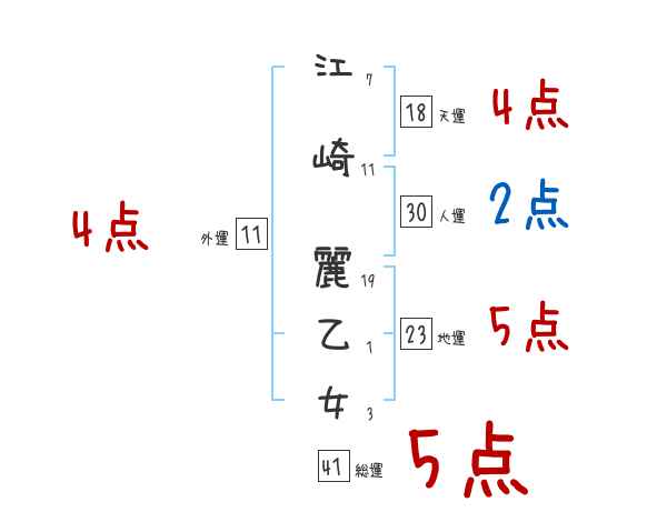 天運![]() | 江崎麗乙女さんの天運は18画の4つ星!情熱的で剛気。忍耐力があり信頼される。 家系が持つ宿命的な運勢を表します。祖先から受け継いだ苗字ですので自分の力が及びません。家柄を象徴します。 |