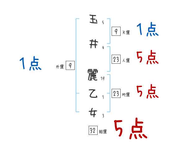 天運![]() | 玉井麗乙女さんの天運は9画の1つ星!消極的で才能を発揮することが苦手なことも。周りの意見に耳を傾けましょう。 家系が持つ宿命的な運勢を表します。祖先から受け継いだ苗字ですので自分の力が及びません。家柄を象徴します。 |