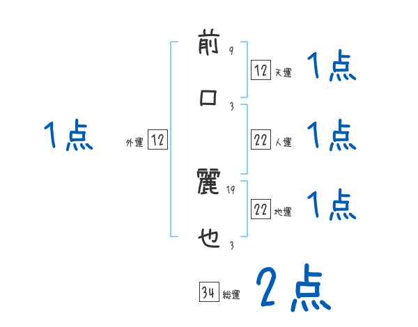 総運![]() | 前口麗也さんの総運は34画の2つ星!独創性に優れるが、自尊心が強く災難に注意しましょう。 あなたの人生を表す1番重要な運勢です。生涯を通じて影響する総合運となり、主に50歳以降の晩年期に影響を及ぼします。 |