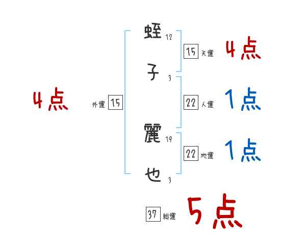 人運![]() | 蛭子麗也さんの人運は22画の1つ星!努力することが苦手ないっぽう手先が器用。芸術性にも優れる。 性格や才能などを表す2番目に重要な運勢です。人間関係や協調性、社会的な成功に影響します。主に20歳から50歳ぐらいまでの中年期の運勢を表します。 |