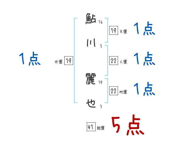外運![]() | 鮎川麗也さんの外運は19画の1つ星!優れた才能を持ちますが、協調性が足りないことも。周りの人と協力する事を意識しましょう。 生活面を象徴する運勢です。外部から受ける影響力を表し、結婚運、家庭運や職場、環境への順応性を表します。 |